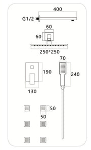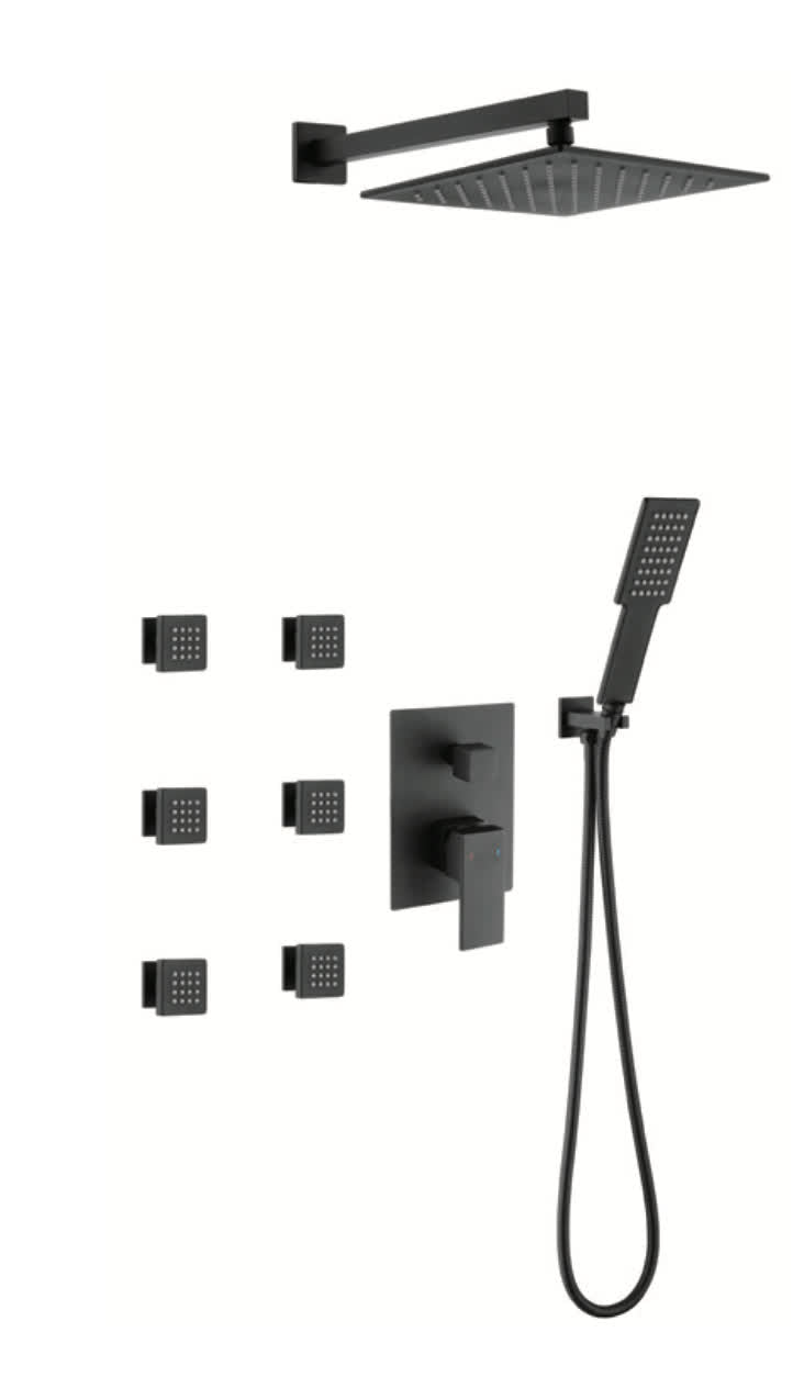 Elevate your bathroom experience with the Tora Three-Function Shower Mixer Set. This concealed mixer with diverter features a luxurious rain shower, 6 massage jets, and a convenient hand shower, all crafted from durable brass. Enjoy a seamless blend of functionality and elegance in your shower space. Perfect for those who appreciate quality and style, this set is designed to enhance your daily routine. Discover the ultimate in shower comfort with Tora.