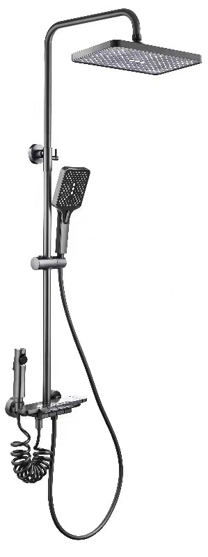 Upgrade your bathroom with the Exposed Shower Set - Grey. This stylish and functional set features a zinc alloy construction with a durable grey finish. The set includes a rain shower head, handheld shower, and diverter valve, giving you the flexibility to choose your preferred shower experience. The rain shower head provides a luxurious rainfall effect, while the handheld shower is perfect for targeted cleaning. The diverter valve allows you to easily switch between the two shower heads.